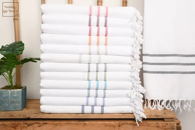 Turkish cotton fibers ensure exceptional softness and durability. Characterized by a flat weave, the towels guarantee optimal absorbency, resulting in quick drying and lightweight properties. Sizes available are 70x40 inches or 100x180 cm for beach towels, and 23x39 inches or 60x100 cm for hand towels, with a manufacturing tolerance of 1-2.5 cm.