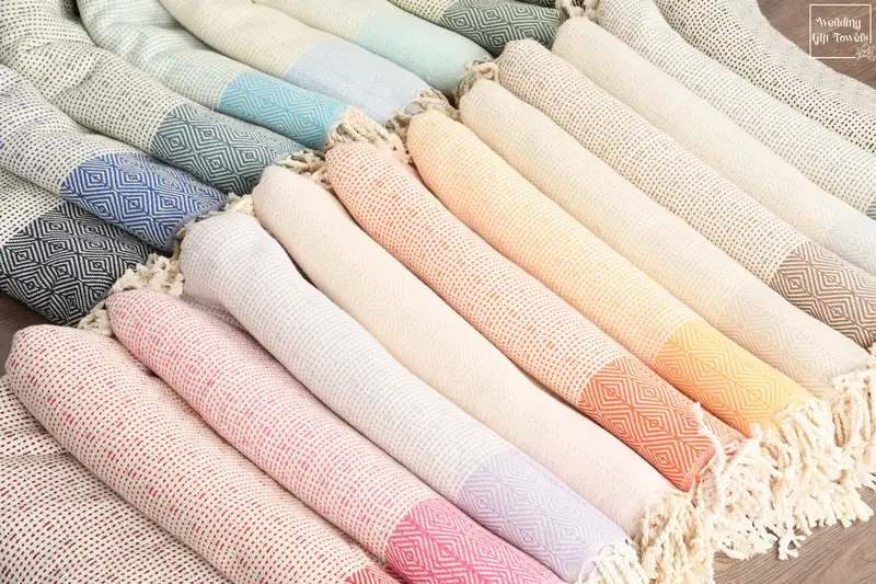The hand-woven Turkish cotton towels are composed of 100% natural cotton fibers, ensuring superior absorbency and breathability. With a flat weave technique, these towels have a lightweight and quick-drying nature, providing comfort in various applications. They measure 70x40 inches or 100x180 centimeters for beach towels and 17x35 inches or 45x90 centimeters for hand towels, with potential tolerances in hand-weaving of 1-2.5 centimeters.