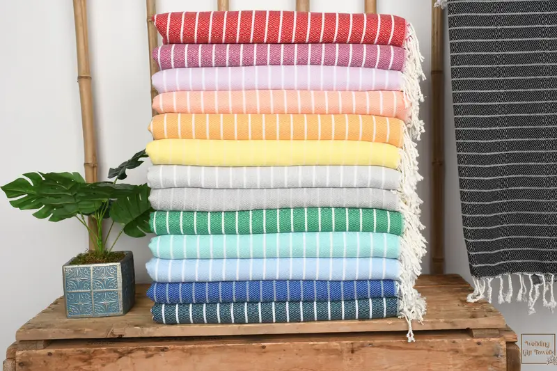 Each Turkish towel, woven meticulously in the artisan's workshop, is comprised of 100% natural cotton. Their flat weave ensures high absorbency, resulting in an efficient and lightweight towel ideal for various applications. Dimensions include a width of 40 inches and a length of 70 inches, equivalent to 100x180 centimeters, with slight variations of 1-2.5cm due to hand-weaving.
