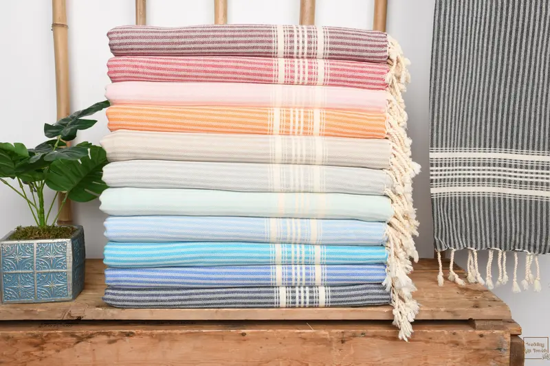 Constructed from 100% natural Turkish cotton, the towels are engineered for superior absorbency and softness, ensuring a premium user experience. Dimensions are specified as 67x38 inches or 170x95 cm, with a tolerance of 1-2.5 cm due to hand-weaving techniques. Each towel weighs 290 grams, facilitating easy packing and portability.