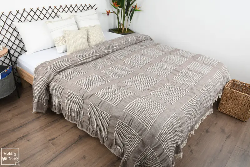 The blanket incorporates 100% natural Turkish cotton fibers, ensuring a gentle texture and high absorbency. Each throw is meticulously hand-woven in a flat weave, resulting in a warm, decorative, and quick-drying product. The blanket's dimensions span 83x79 inches or 200x210 cm, weighing 1675 grams, and exhibits slight variations of 1-2.5cm due to hand-weaving.