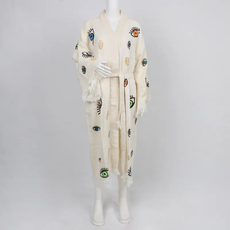 El albornoz está fabricado con un tejido suave de alta calidad, lo que garantiza una absorción y comodidad superiores. Diseñado para brindar versatilidad, mide aproximadamente 56 pulgadas de largo y 36 pulgadas de ancho, con un GSM de 300 gramos, lo que ofrece durabilidad y suavidad. Las tolerancias de tejido a mano están entre 1 y 2,5 cm para un ajuste preciso.